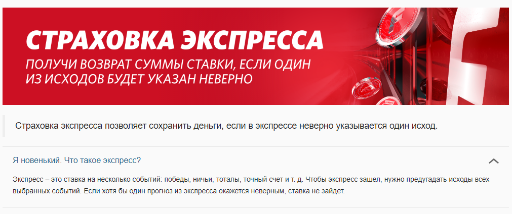 - «Страховка экспресса». Позволяет получить возврат суммы ставки, если один из исходов будет указан неверно. Те, кто живет ставками типа «экспресс», пользуются именно «Фонбет», поскольку другие букмекеры не предоставляют такой возможности подстраховаться.