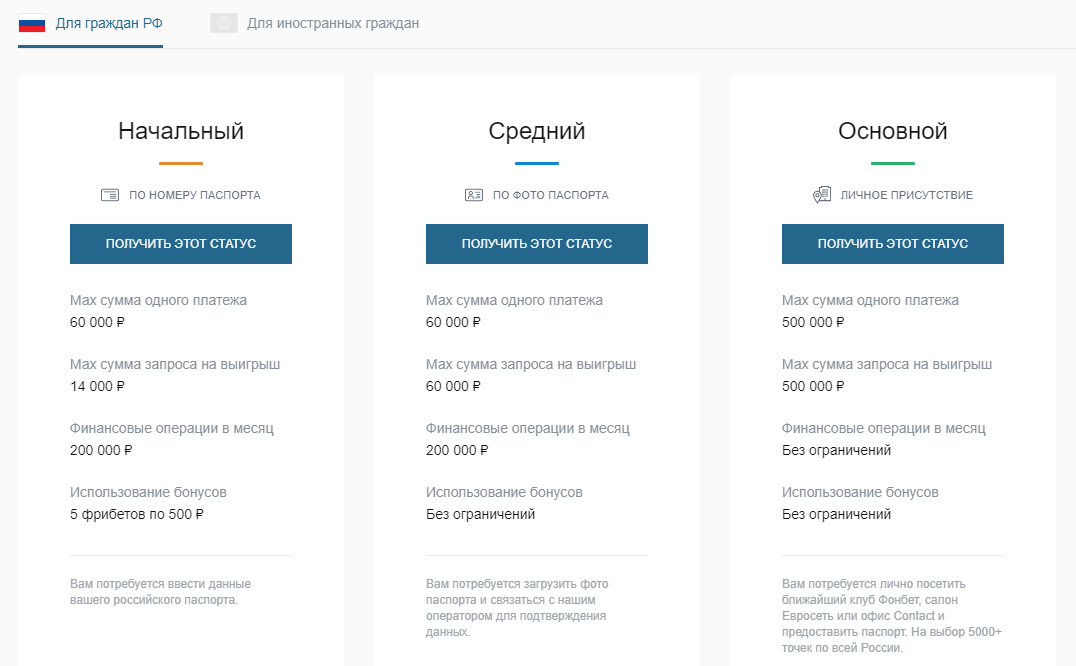 На «Фонбет» предусмотрены три статуса в зависимости от того, каким образом будет пройдена идентификация: по номеру паспорта, по фото паспорта или посредством личного присутствия.