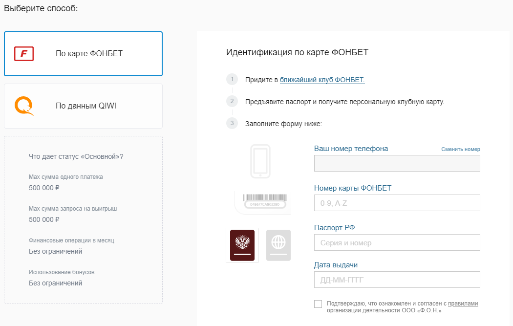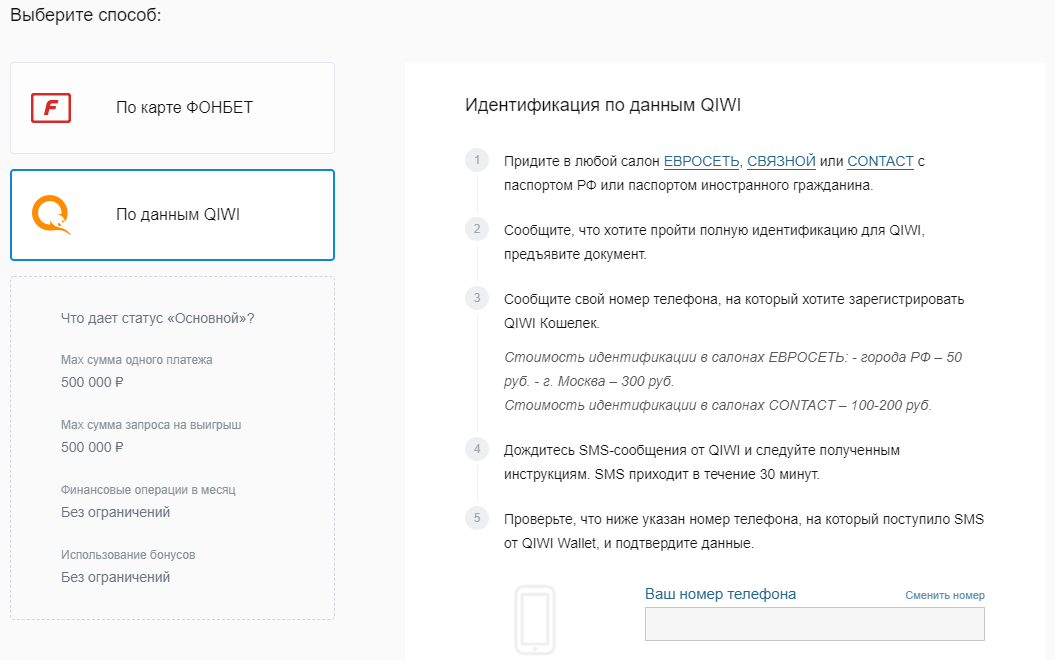 В последнем случае можно пройти идентификацию по персональной карте клуба «Фонбет» или по данным QIWI-кошелька. При прохождении идентификации в платежной системе QIWI идентификация в ЦУПИС не требуется (Центре учета интерактивных ставок).