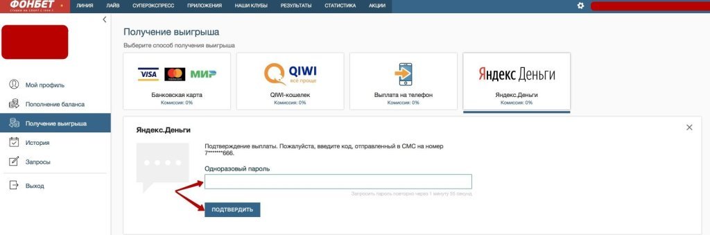 Для получения выигрыша необходимо зайти в личный кабинет и перейти на вкладку «Пополнение и выплаты». Вывод денег с «Фонбет» возможен на карту Visa, Mastercard и «Мир». Также доступны другие платежные методы: